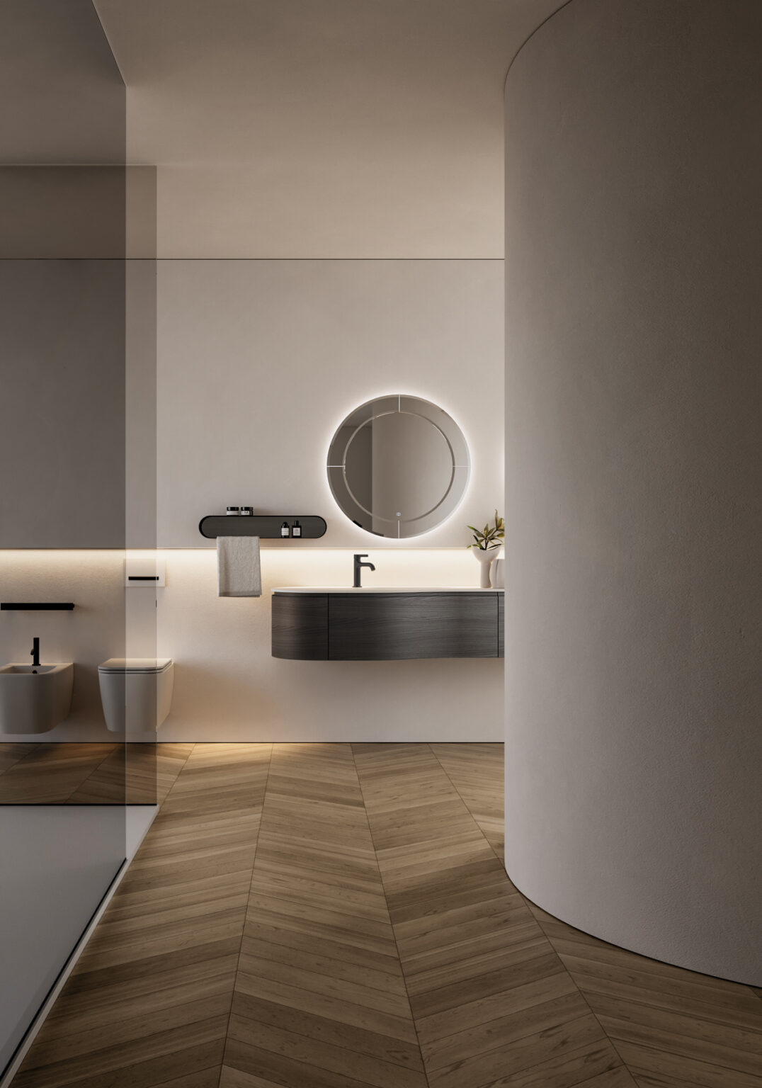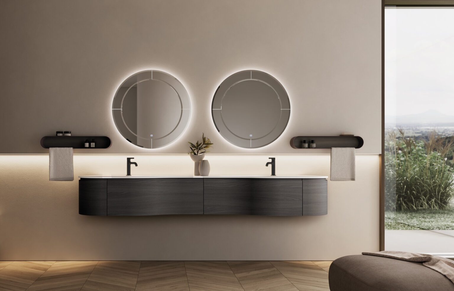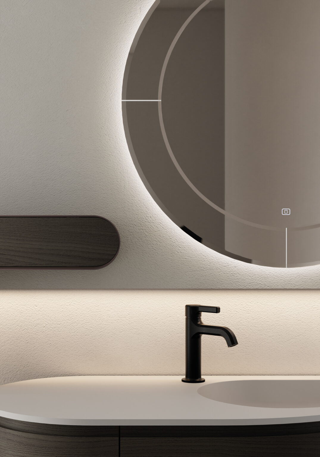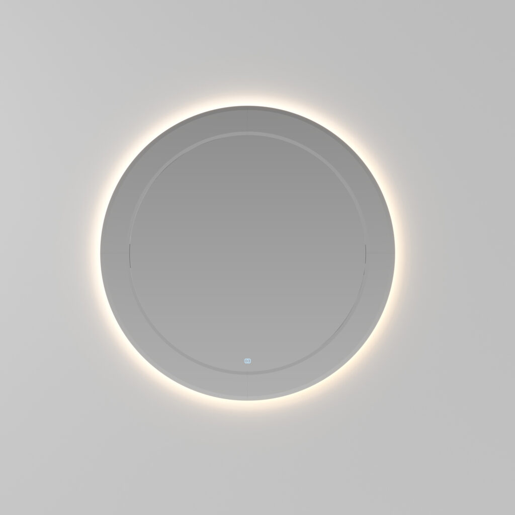 Espejo Marte con marco perimetral de espejo achaflanado, con retroiluminación de led, con teclado de encendido táctil ON/OFF y regulación de la temperatura de color 2700/6000 K. No compatible con otras lámparas. IP44 De 17 a 25 W – De 1350 a 2100 lm