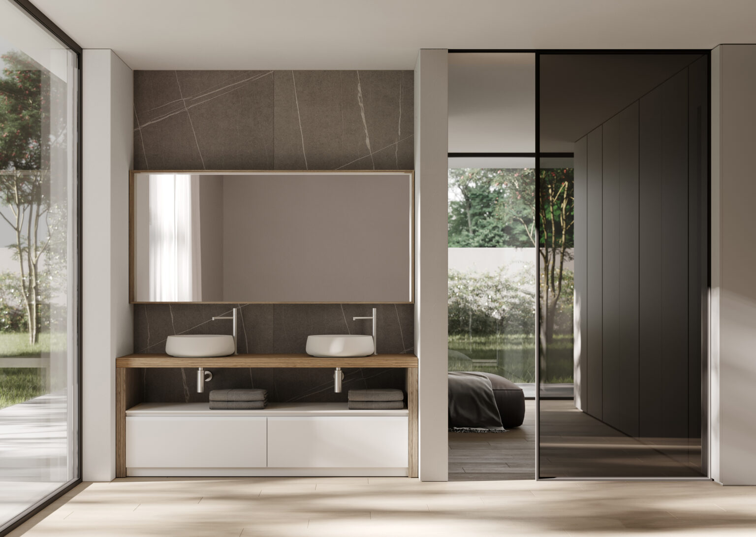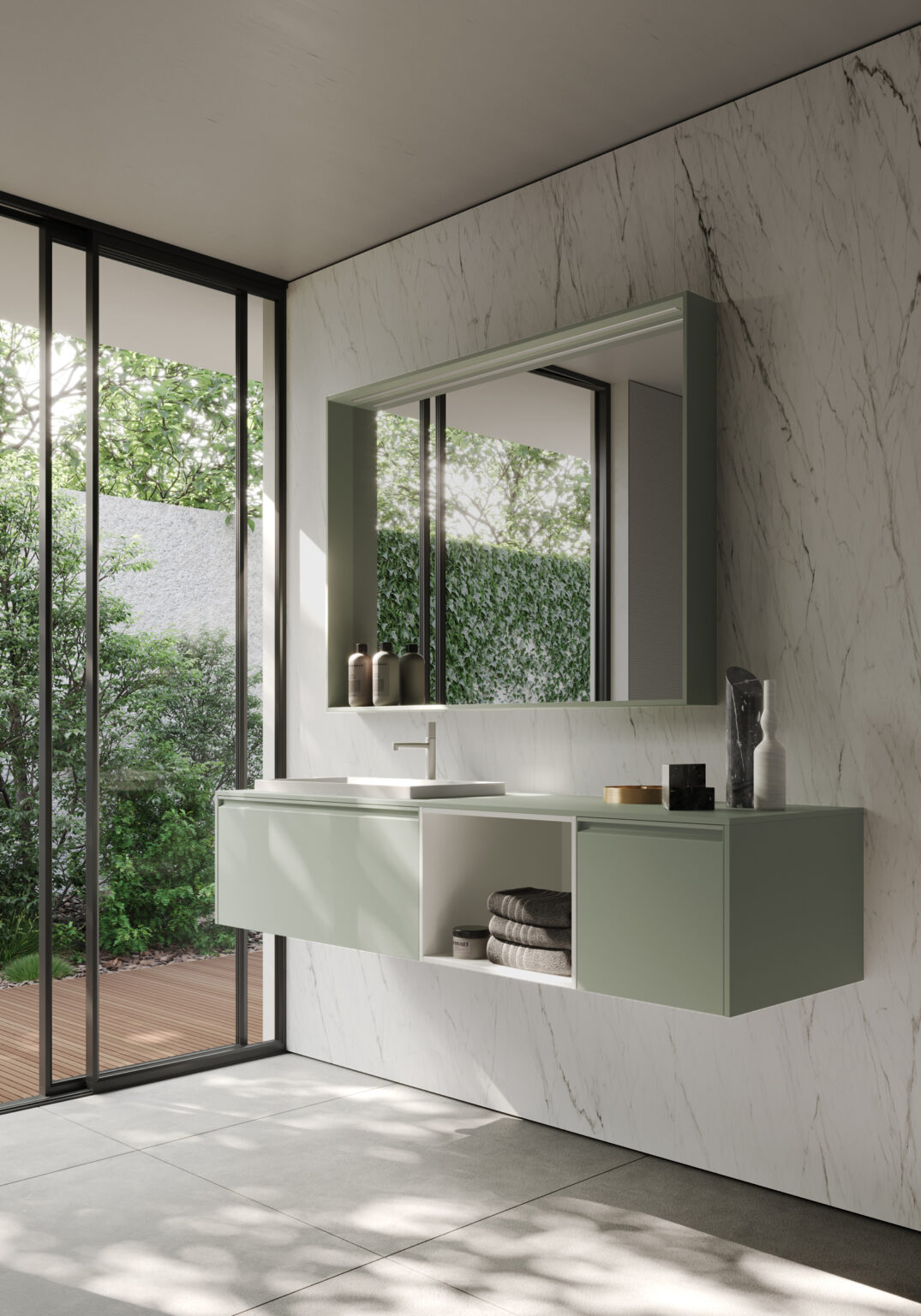 Espejo Nest con marco y luz superior integrada de led. Se pueden añadir elementos sin puertas H 70 a la derecha y a la izquierda. Sin tomas ni interruptores. No se pueden instalar elementos sin puertas en los espejos con anchuras de 62 a 72 cm. IP44 – 4000 K De 10 a 33 W – De 660 a 2350 lm