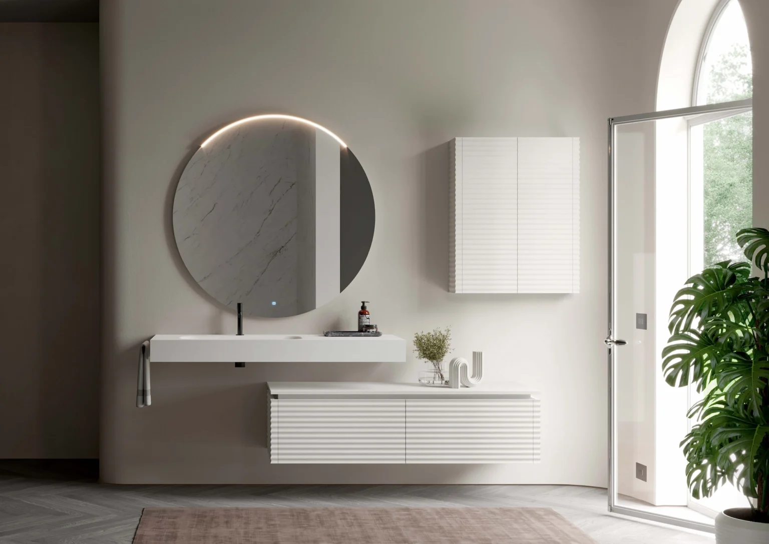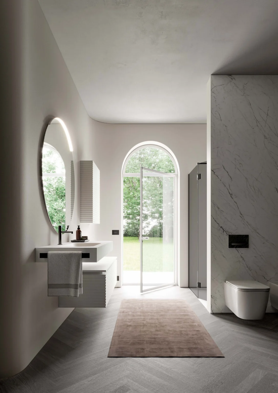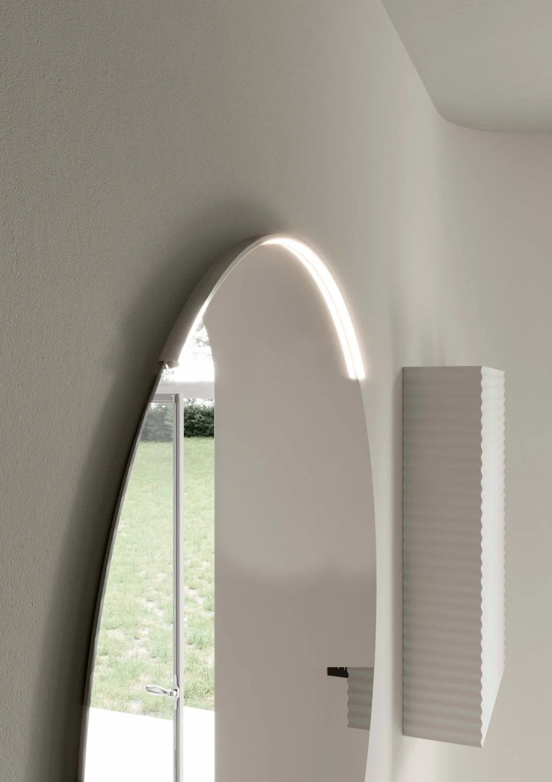 Lámpara Arko instalable en los espejos de la familia Lap. Equipada con iluminación de led. IP44 – 3000/4000 K De 6 a 12 W– De 650 a 1350 lm