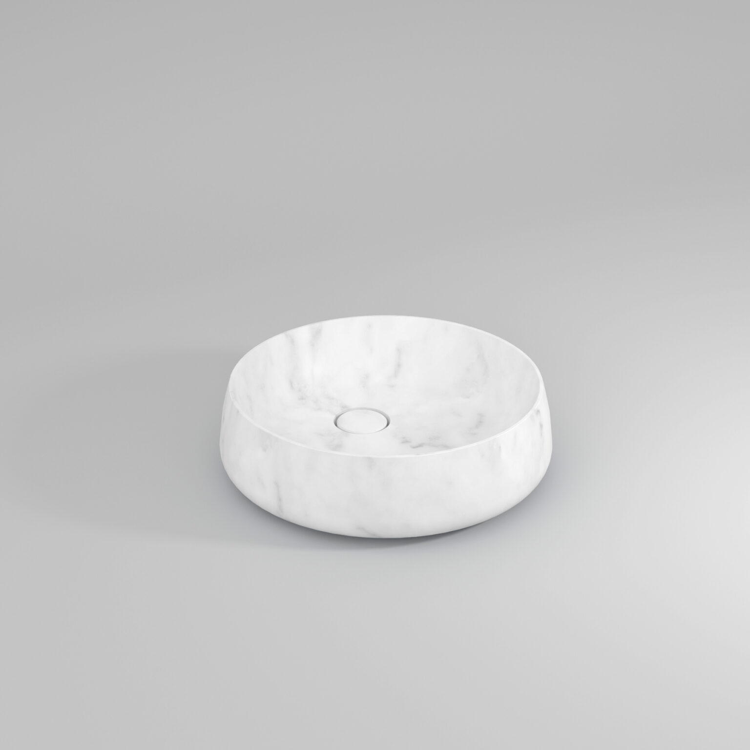 Lavabo Beauty sobre encimera, de mármol natural, sin rebosadero, completo con válvula de desagüe siempre abierta del mismo acabado. Disponible para encimeras lineales de 36 y 45,5 cm de profundidad.