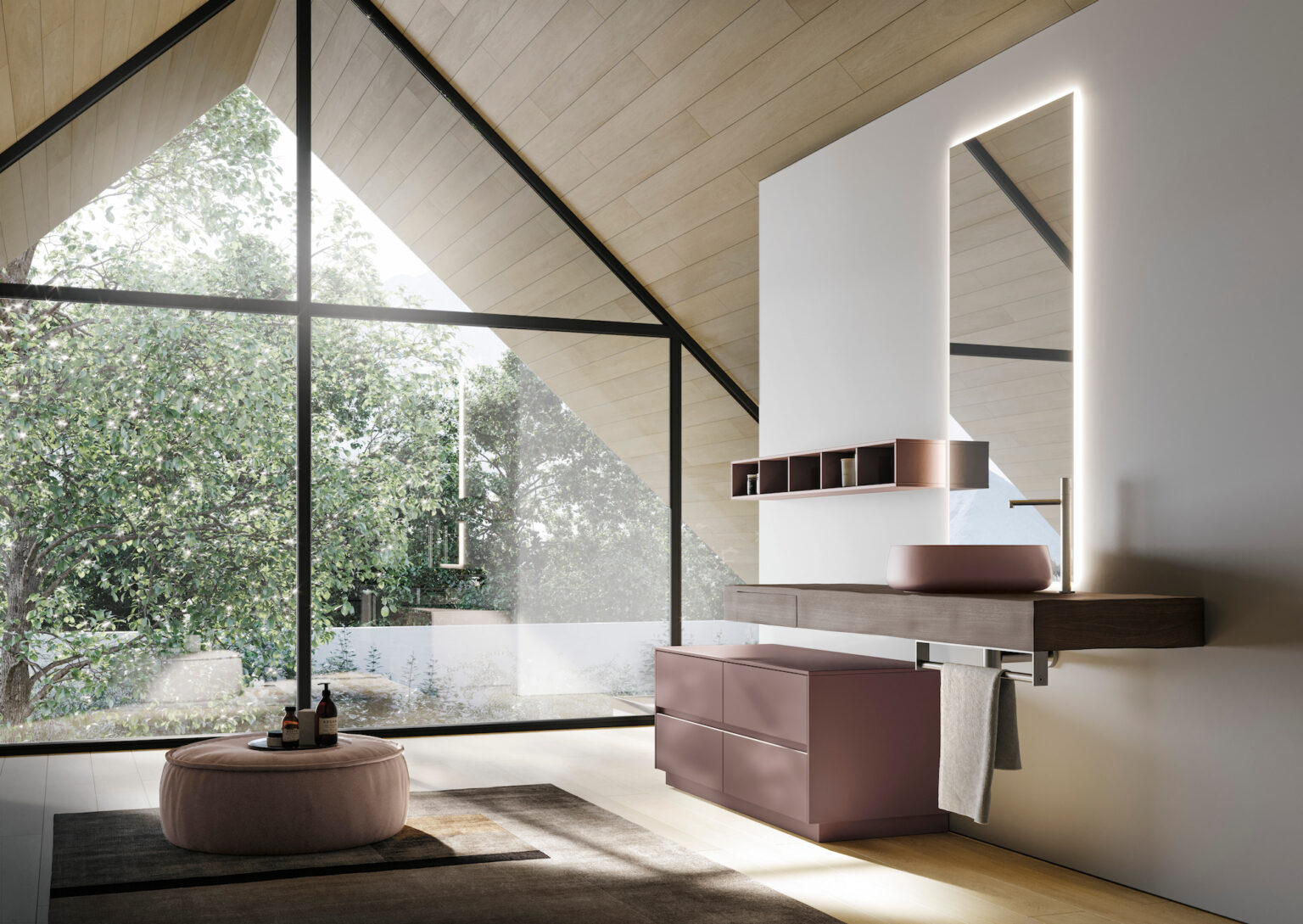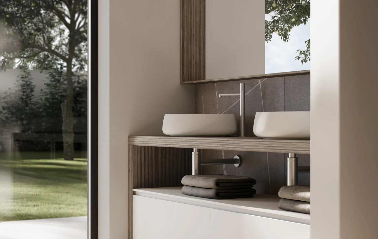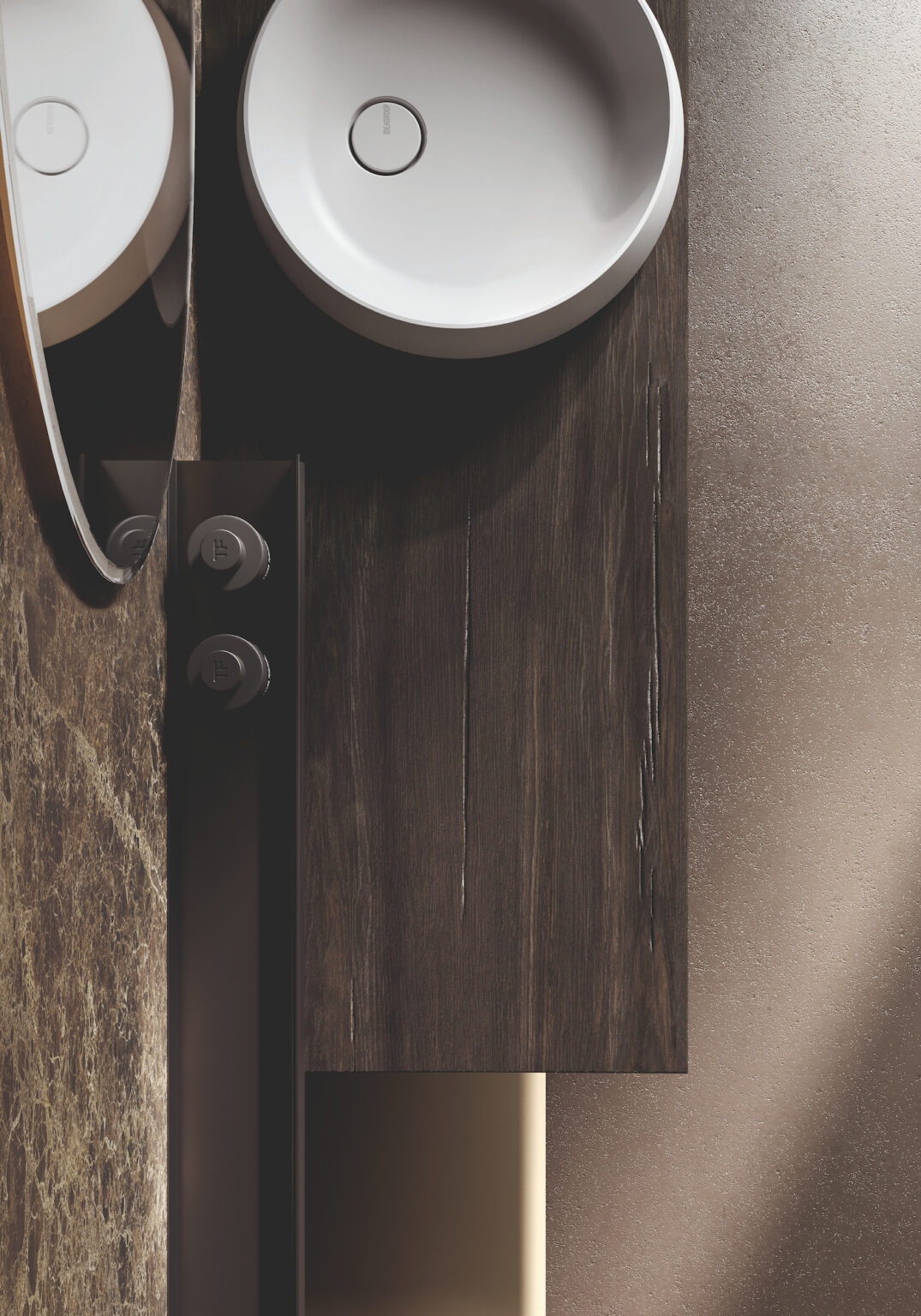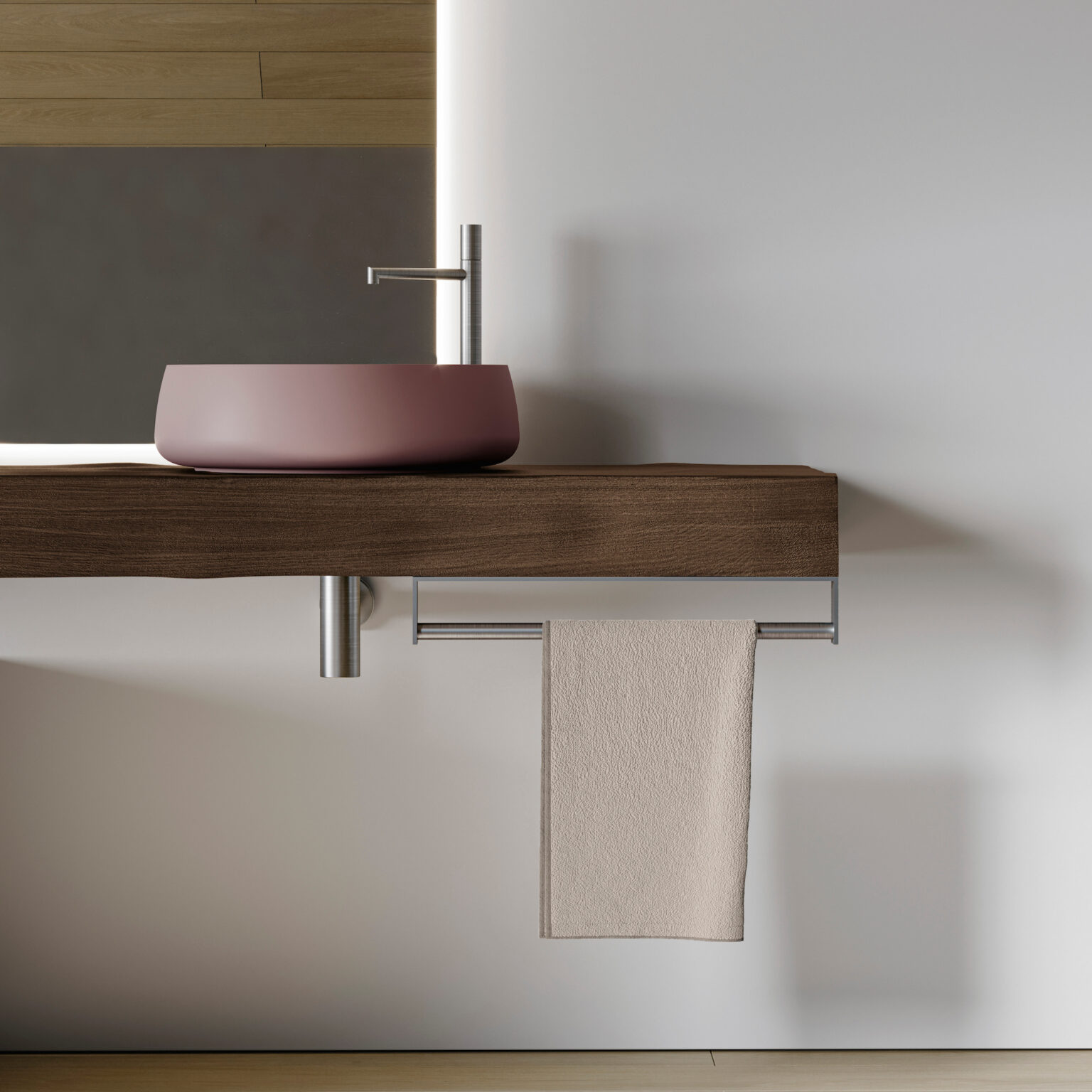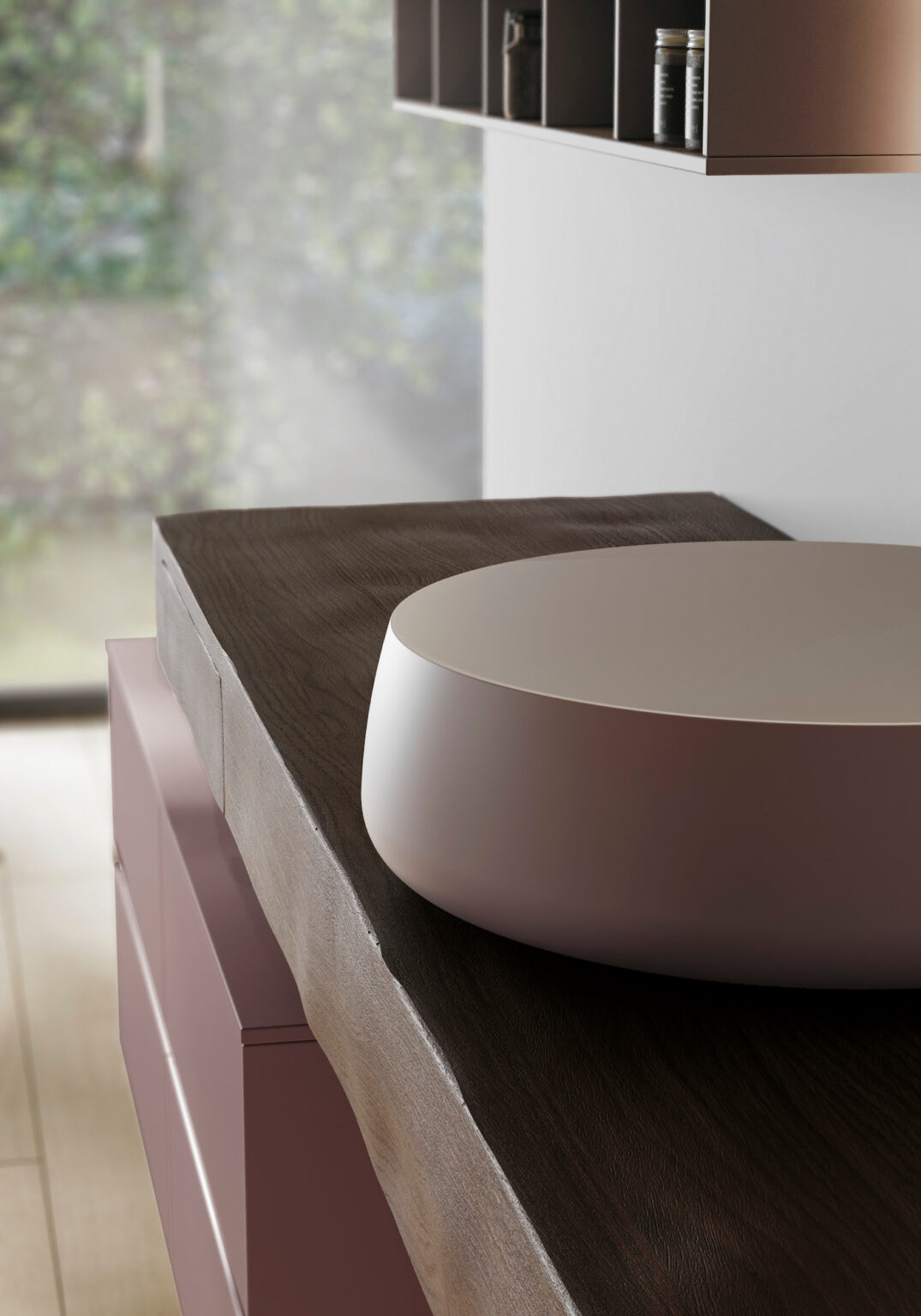 Lavabo Beauty sobre encimera, de Cristalplant® blanco mate, coloreado exteriormente o completamente coloreado en los colores mate y Metal Colour Ideagroup (colores Metal sólo para exterior). Sin rebosadero. Disponible para encimeras lineales de 36 y 45,5 cm de profundidad.