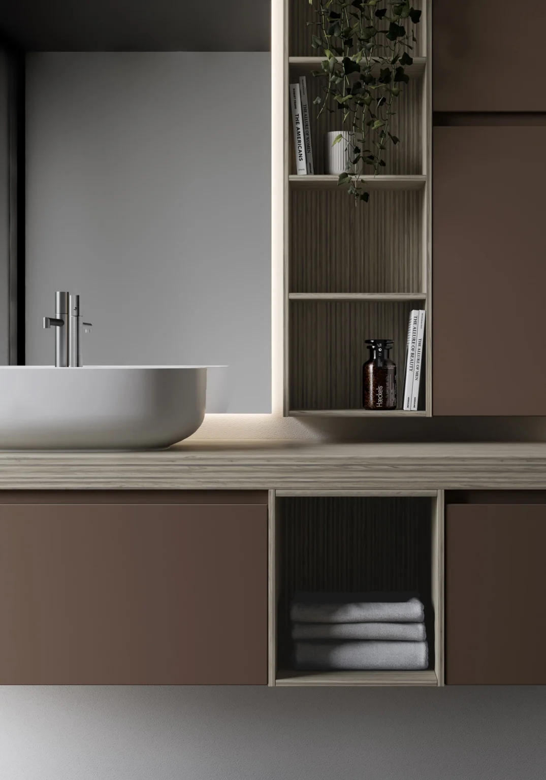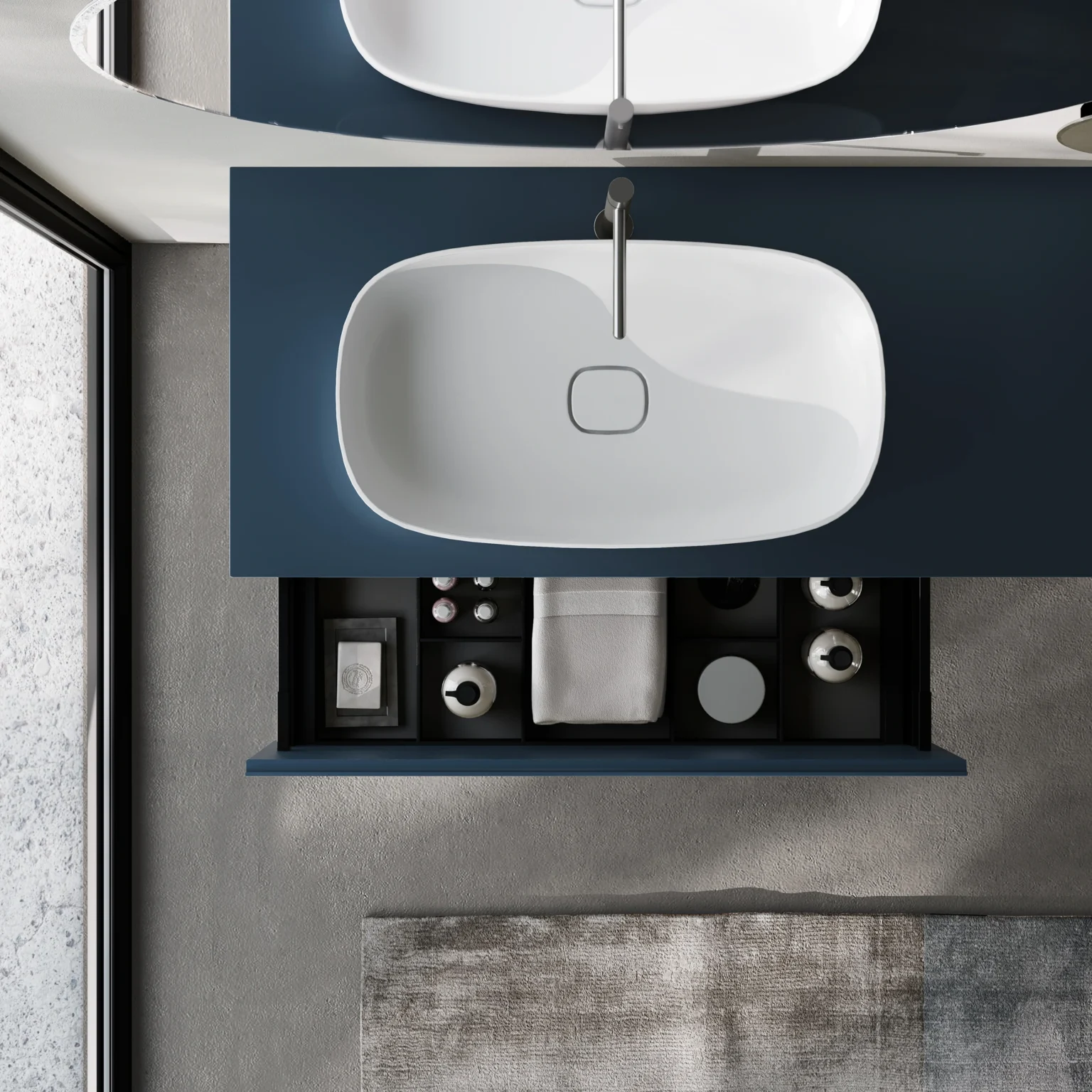 Los lavabos de Mineralsolid/Mineralux están compuestos de cargas naturales (carbonatos de calcio y trihidratos de aluminio) y resinas de poliéster. La película de gelcoat que recubre la superficie es un poliéster de acrilato que otorga un acabado de efecto mate.