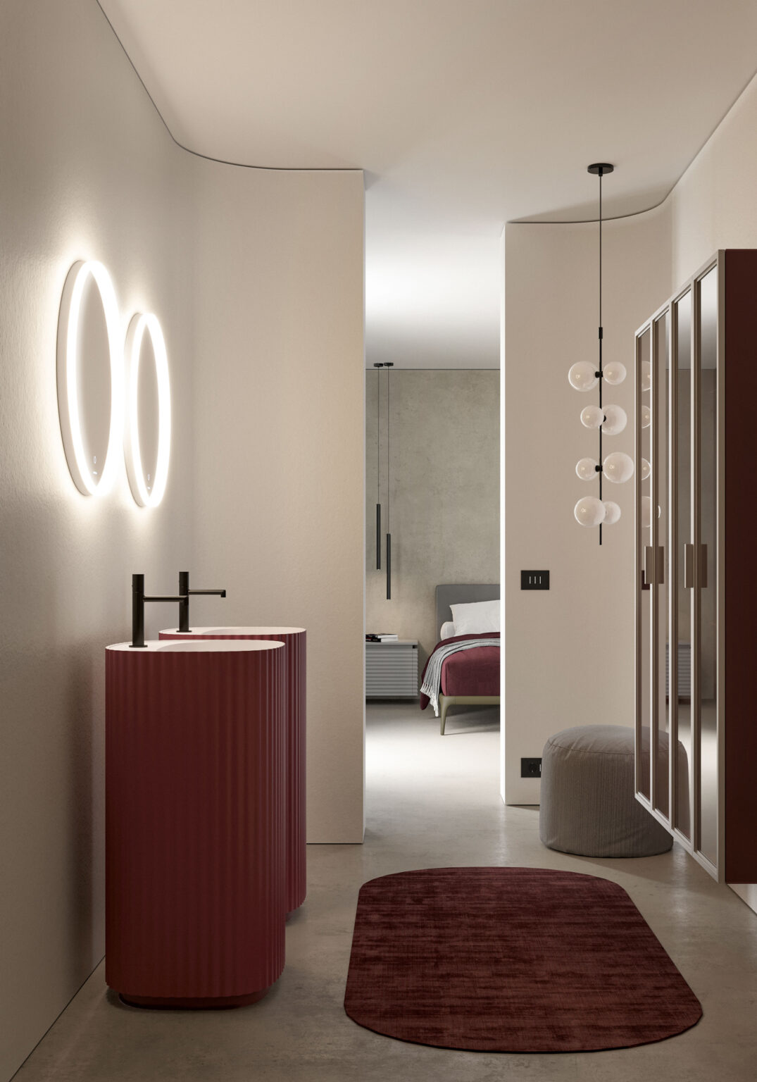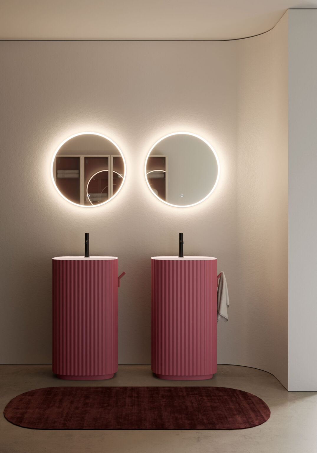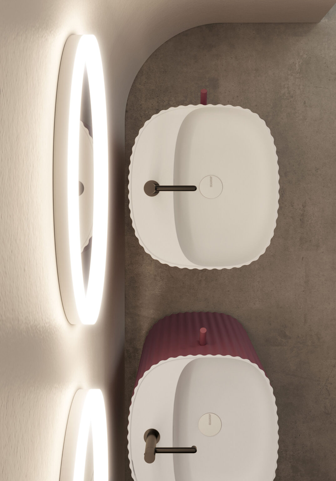 Lavabo independiente Giove02 de Cristalplant® blanco mate, coloreado exteriormente o completamente coloreado en los colores mate y Metal Colour Ideagroup (colores Metal sólo para exterior). Con orificio para grifo y rebosadero.