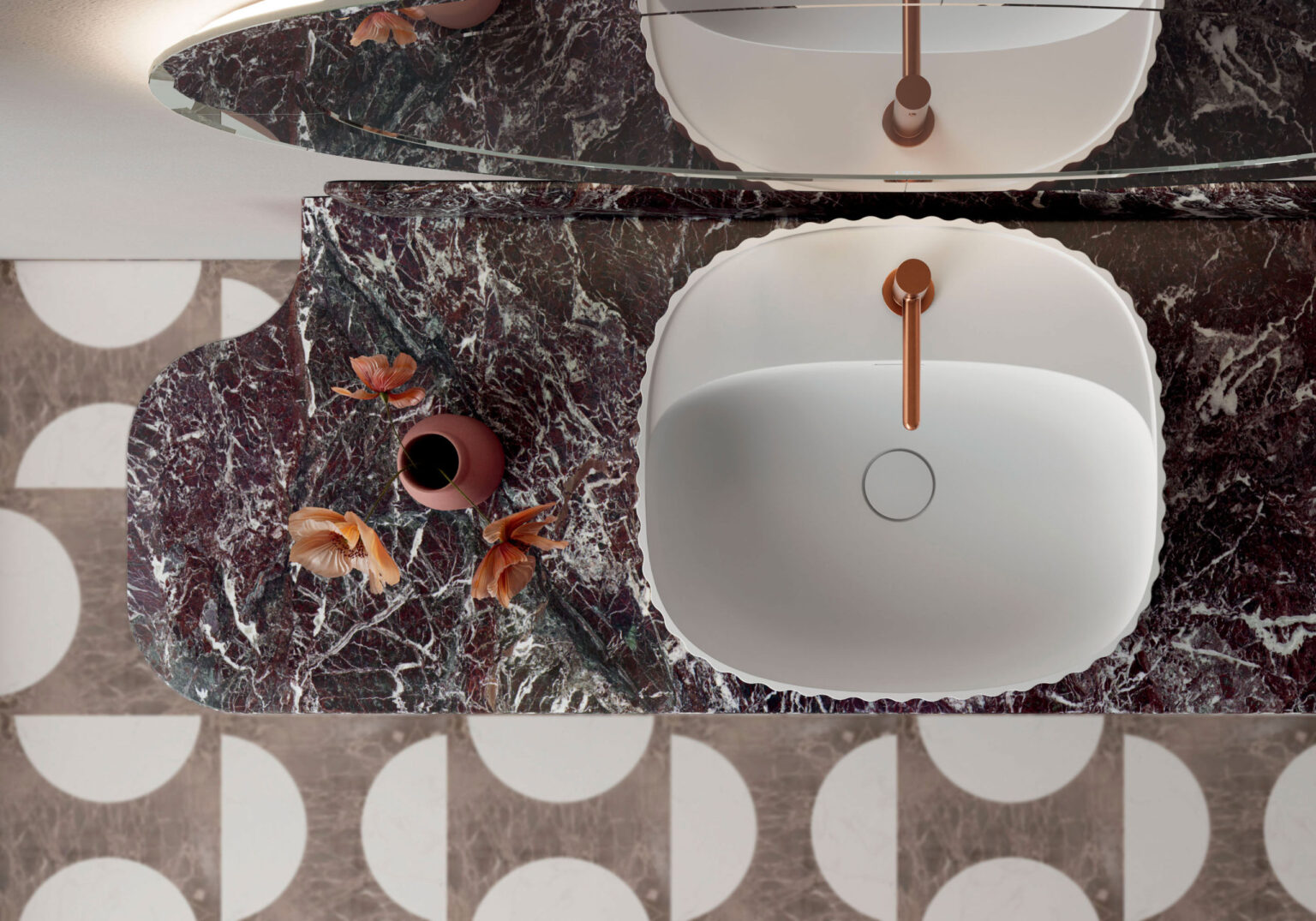 Lavabo Giove04 sobre encimera, de Cristalplant® blanco mate, coloreado exteriormente o completamente coloreado en los colores mate y Metal Colour Ideagroup (colores Metal sólo para exterior). Con orificio para grifo y rebosadero.
