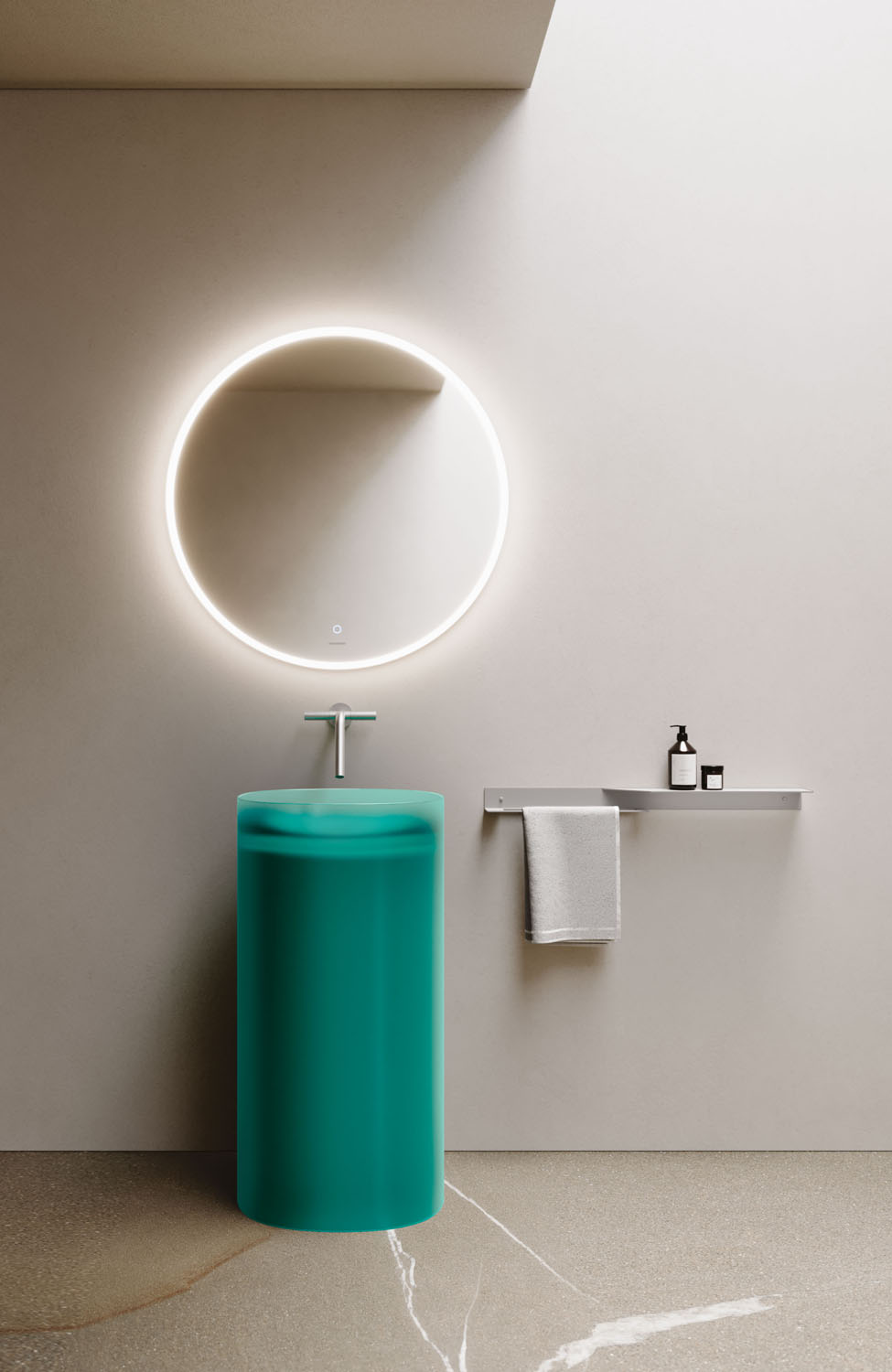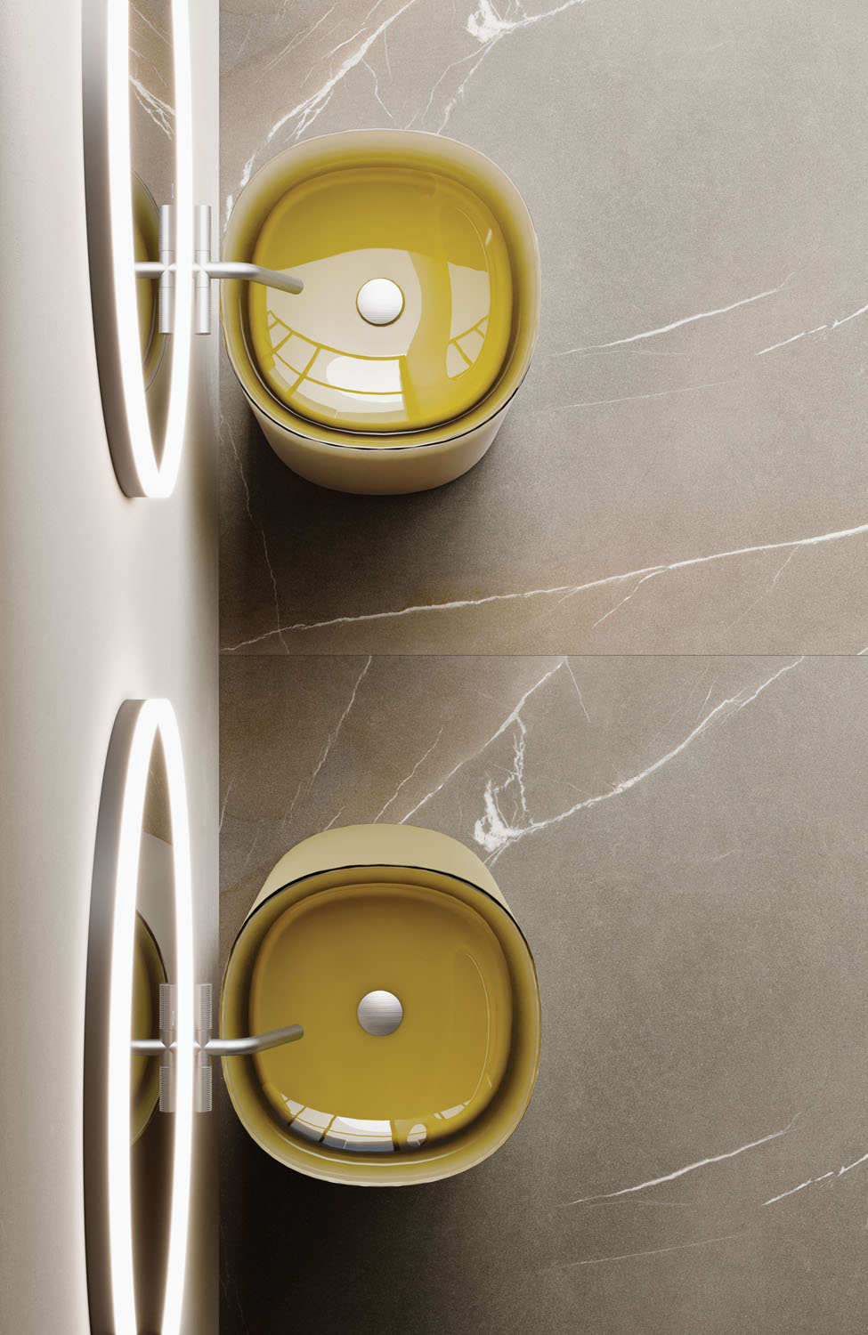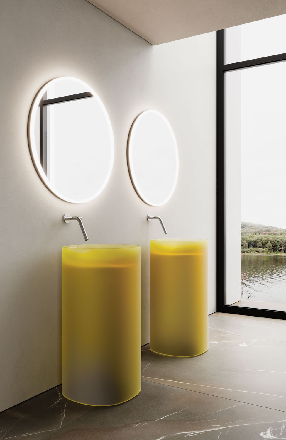 Lavabo independiente Habe, de Khromalite, en acabado exterior e interior brillante, o satinado sólo en el exterior, disponible en 5 colores; sin rebosadero.