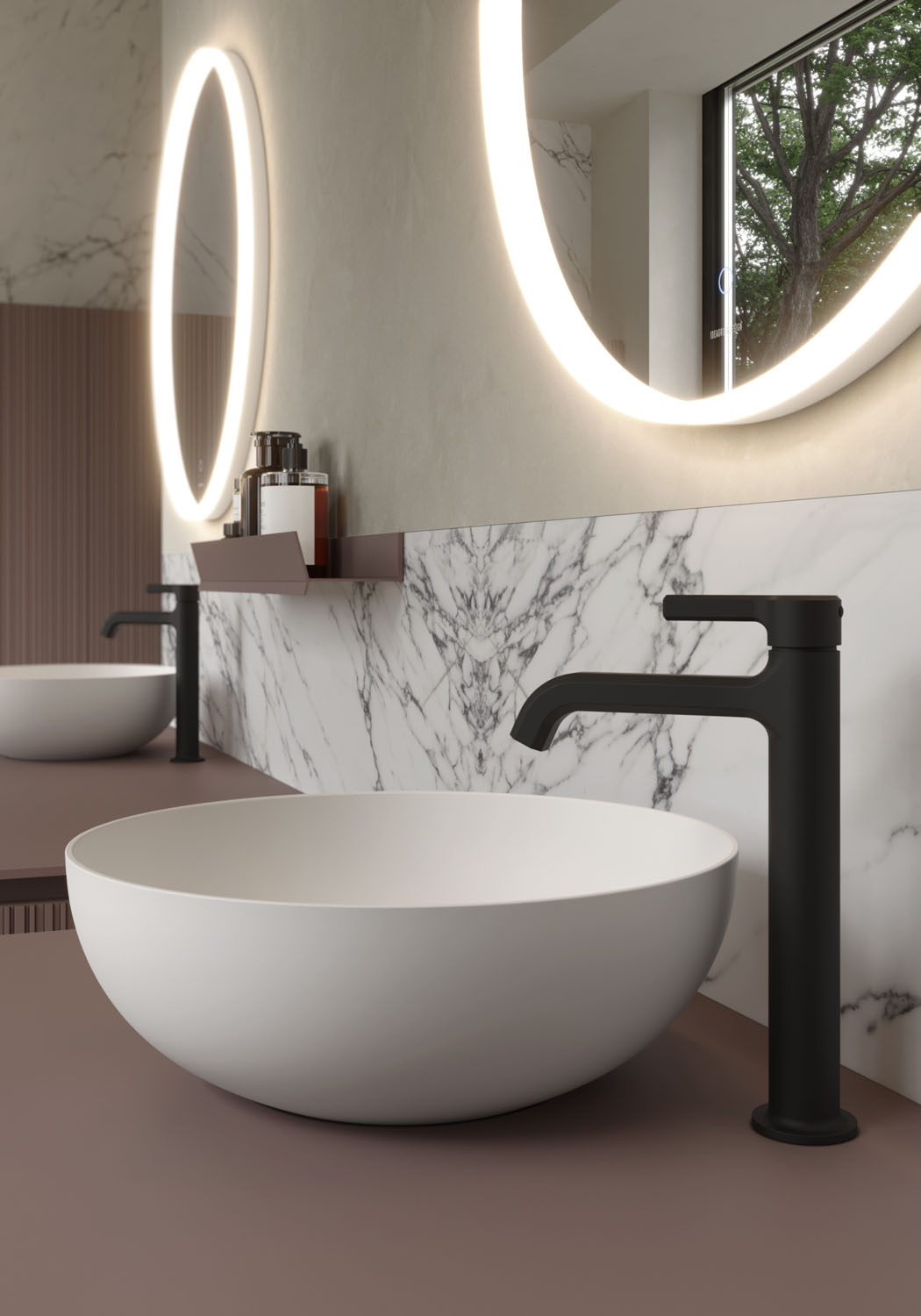 Lavabo Laguna04 sobre encimera, de Cristalplant® blanco mate, coloreado exteriormente o completamente coloreado en los colores mate y Metal Colour Ideagroup (colores Metal sólo para exterior). Sin rebosadero. Disponible para encimeras lineales de 36 y 45,5 cm de profundidad y para encimeras curvas.