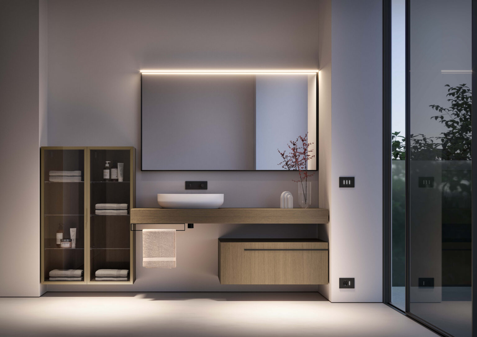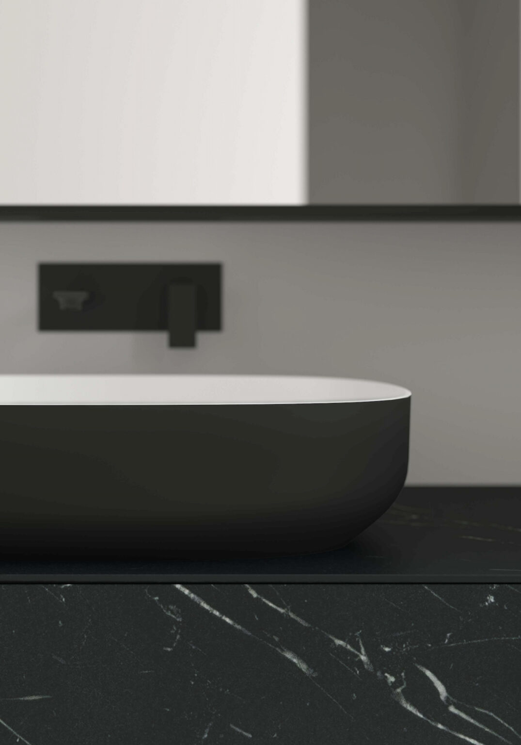 Lavabo Laguna06 sobre encimera, de Cristalplant® blanco mate, coloreado exteriormente o completamente coloreado en los colores mate y Metal Colour Ideagroup (colores Metal sólo para exterior). Sin rebosadero. Disponible para encimeras lineales de 36 y 45,5 cm de profundidad.