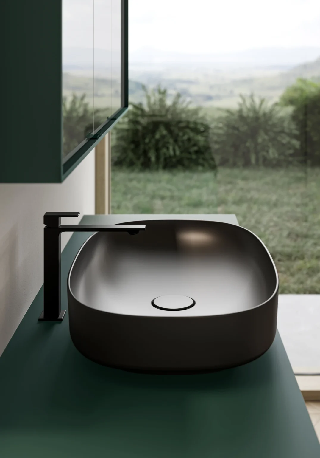 Lavabo Pool sobre encimera, de cerámica blanca brillante, blanca mate y negra mate, sin rebosadero. Disponible para encimeras de 36 y 45,5 cm de profundidad.