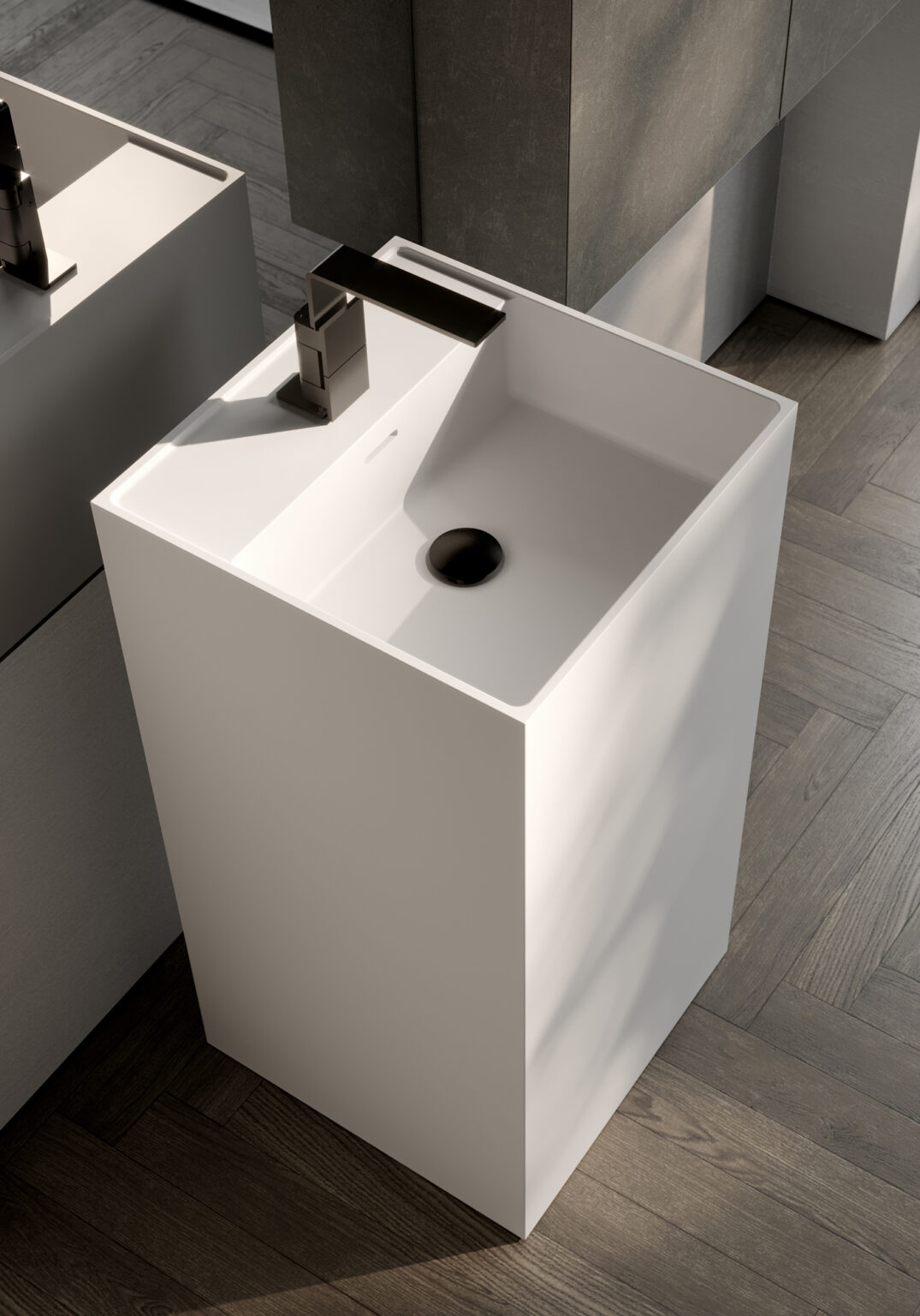 Lavabo independiente Quadro de Cristalplant® blanco mate, coloreado exteriormente o completamente coloreado en los colores mate y Metal Colour Ideagroup (colores Metal sólo para exterior). Con orificio para grifo (bajo demanda, sin orificio) y rebosadero.