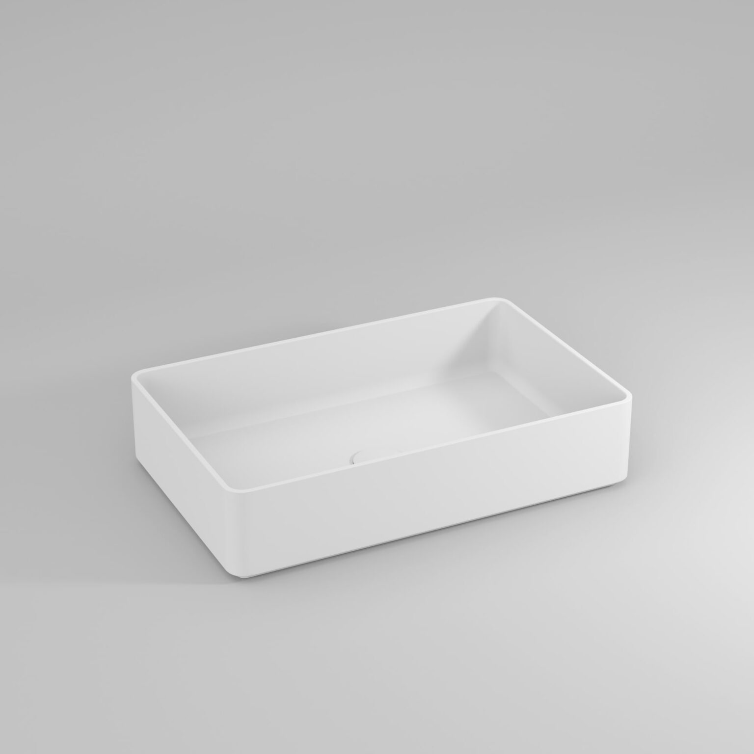 Lavabo Riva06 sobre encimera, de Cristalplant® blanco mate, coloreado exteriormente o completamente coloreado en los colores mate y Metal Colour Ideagroup (colores Metal sólo para exterior). Sin rebosadero. Disponible para encimeras lineales de 45,5 cm de profundidad.