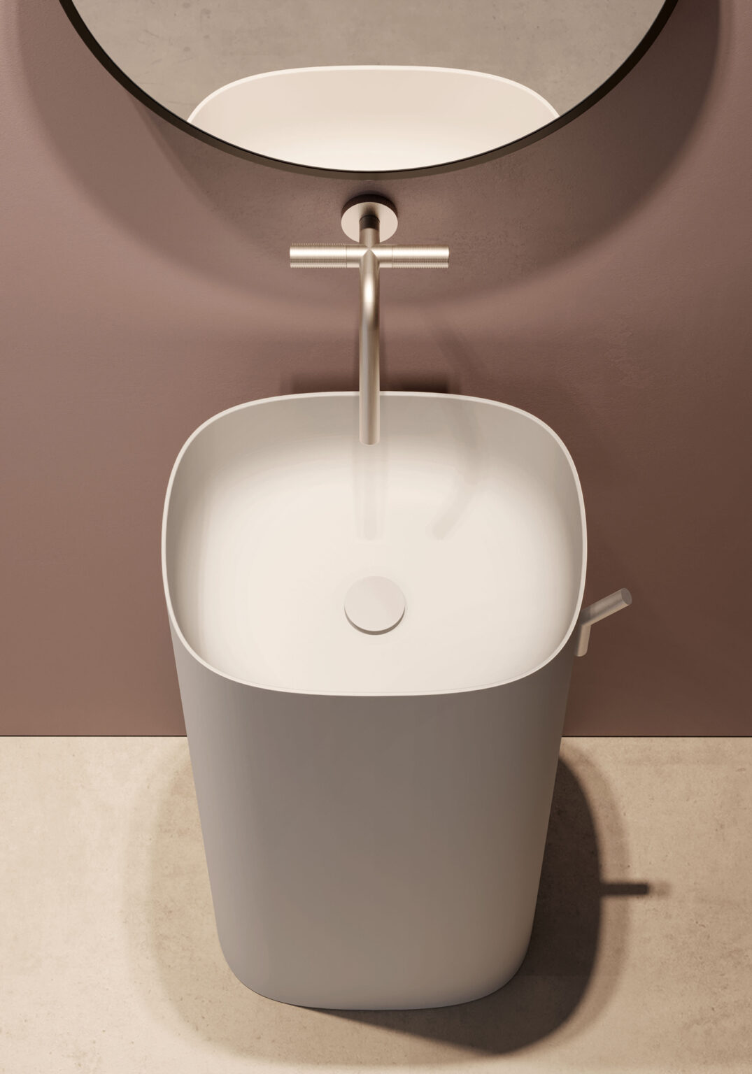 Lavabo independiente Saturno, de Cristalplant® blanco mate, coloreado exteriormente o completamente coloreado en los colores mate y Metal Colour Ideagroup (colores Metal sólo para exterior). Sin rebosadero.