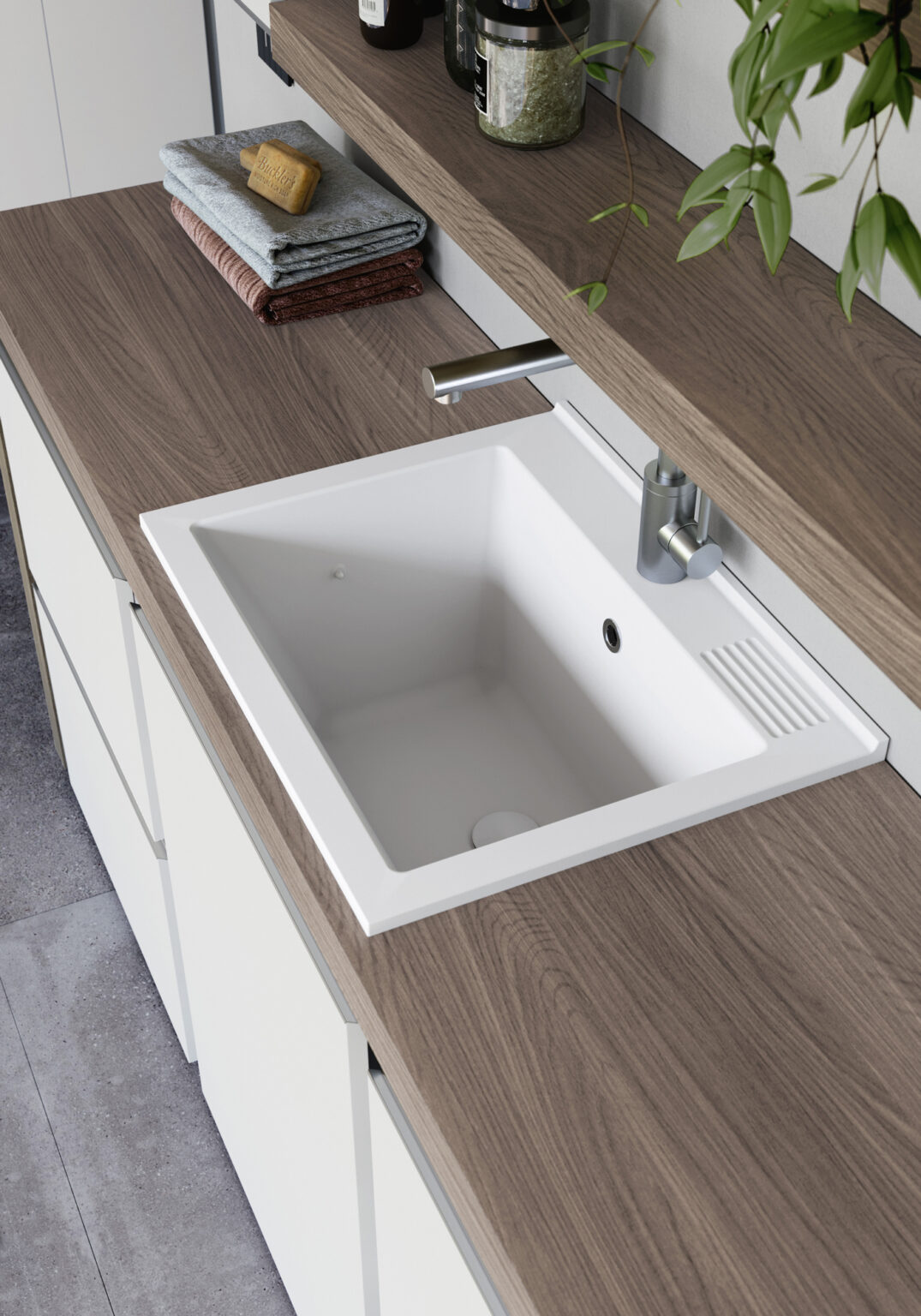 Pileta de lavar Tipo B de Mineralux o Mineralsolid blanco mate o brillante, con orificio para grifo (bajo demanda, sin orificio) y rebosadero (aro cromado). Tabla de lavar de madera, bajo demanda.