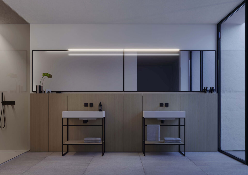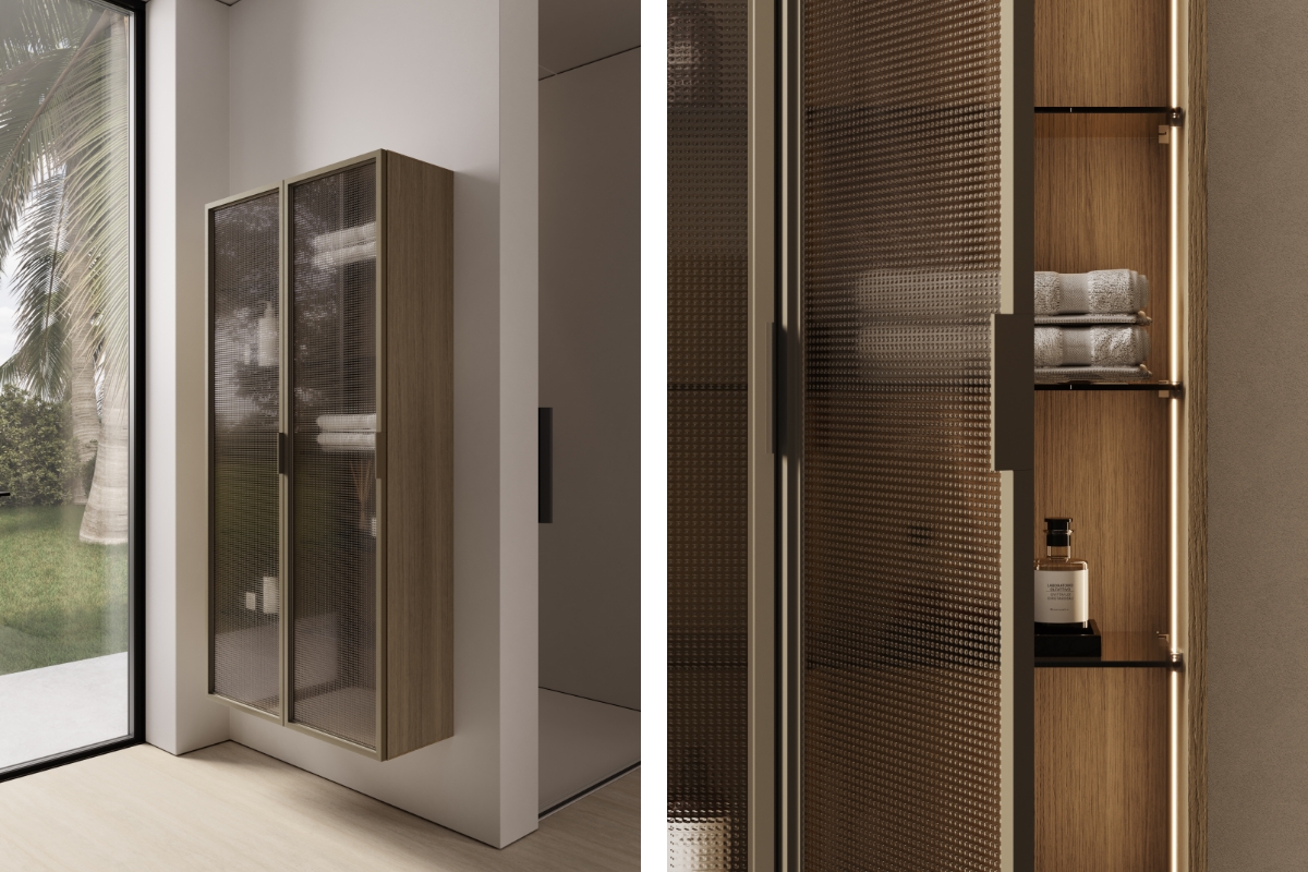 En la solución de muebles altos o columnas, las puertas pueden ser de vidrio Fumé o caracterizarse por un «cuadriculado» que oculta a la vista los objetos de la rutina de belleza, o bien pueden ser «espejadas de doble cara».