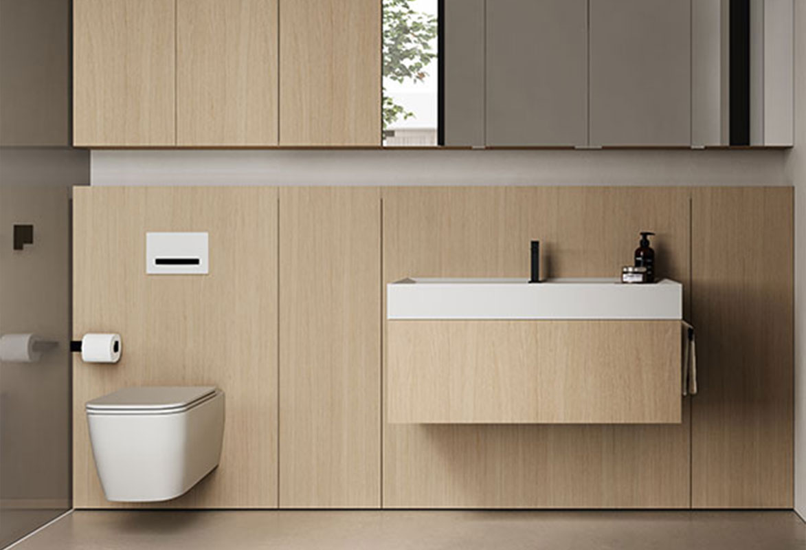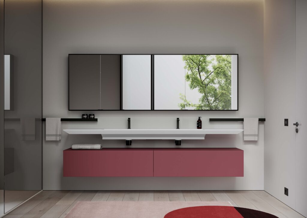 Boiserie mural de contención con módulos de apoyo en el suelo de diferentes anchuras y profundidades, diseñada para guardar pequeños objetos y accesorios para el cuidado diario de la persona o para ocultar instalaciones. Además, el mueble ofrece una cómoda superficie de apoyo oculta frontalmente a la vista por las puertas que sobresalen. El sistema está diseñado en combinación con lavabos independientes, marcos de aluminio y composiciones de pie sobre zócalos.