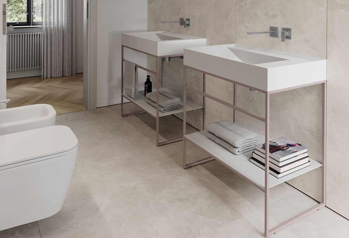 Es posible revestir frentes, laterales y encimeras de gres –rugoso o flameado– recreando un elegante efecto escenográfico y monolítico del mueble de baño.