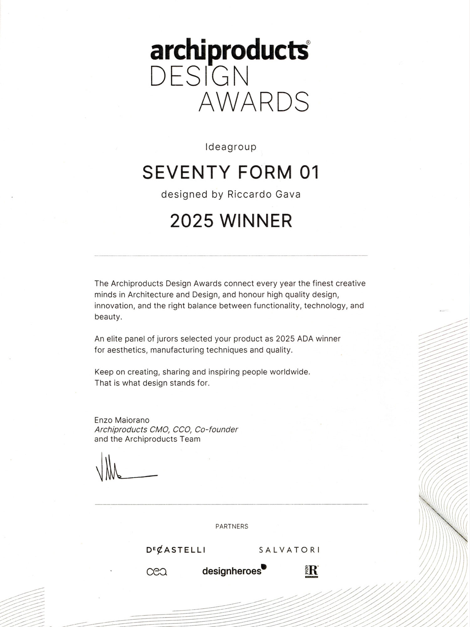 El modelo Seventy • Form, diseñado por Riccardo Gava, ha sido seleccionado en los Archiproducts Design Awards 2025: el premio que celebra la excelencia del diseño internacional y recompensa a las empresas y diseñadores que han sabido trabajar juntos para dar forma a soluciones en equilibrio entre estética, funcionalidad e innovación.